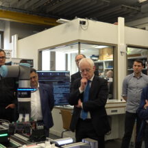Der Besuch in Saarbrücken begann im Embedded Robotics Lab (EmRoLab) mit einer Führung durch das Testfeld Digitalisierung von Mario Korherr. Das Labor unterstützt den Praxisbezug in der Lehre sowie die anwendungsorientierte Forschung und Entwicklung. Schwerpunkte sind die Bereiche Multi-Core Embedded Systems, Echtzeitsysteme, Sensornetzwerke, Softwarevariabilität von Steuerungssystemen und mobile Robotersysteme.
