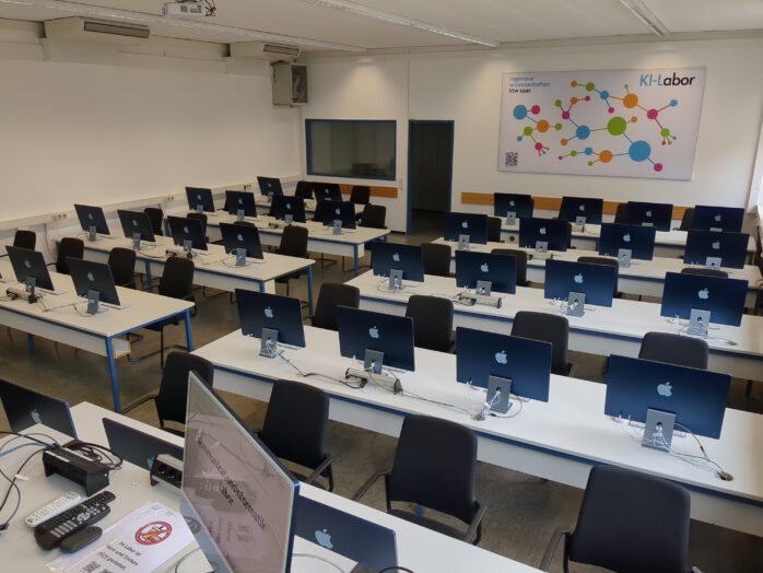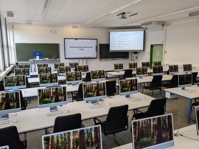 Frisch Farbe und bequeme Stühle schaffen selbst für lange Lernphasen eine angenehme Arbeitsatmosphäre. Das zentrale Element der Modernisierung ist allerdings die neue Hardware-Ausstattung: Nach 7 Jahren Dauerbetrieb lösen neue Apple iMacs mit 5K Display ihre Vorgänger ab und bieten ausreichend Rechenleistung für moderne Softwareentwicklung. Ebenso wurden moderne Präsentations- und Lehrmittel integriert: eine großformatige Digitaltafel, ein Laserbeamer und eine Kameraausstattung für Präsentationen, interaktive Lehr- und Gruppenarbeiten und hybride Veranstaltungen vervollständigen die Ausstattung.