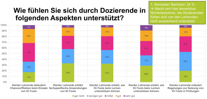 - Rolle der Dozierenden: Viele Studierende fühlen sich von den Lehrenden nicht ausreichend unterstützt, wenn es darum geht, die Regelungen zur Nutzung von KI-Tools in Prüfungen zu erläutern oder die notwendigen KI-Kompetenzen für die Arbeitswelt zu vermitteln.
