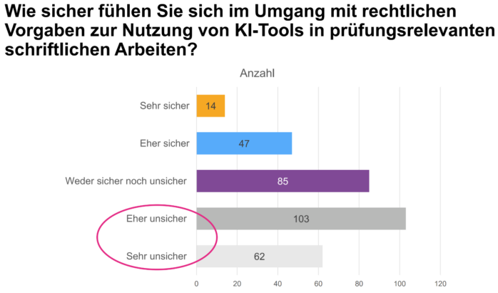 - Rechtliche Unsicherheit: Die Mehrheit der Studierenden (165 von 321) fühlt sich „sehr unsicher“ oder „eher unsicher“ im Umgang mit rechtlichen Vorgaben zur KI-Nutzung in prüfungsrelevanten Arbeiten.