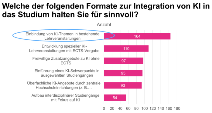 Die aufschlussreichen Antworten dienen als wichtige Grundlage, um die Rolle von KI im Studium zu verstehenden und darauf basierend die bestehenden, umfangreichen Unterstützungsangebote bedarfsgerecht weiterzuentwickeln. Letztendlich geht es darum, die Integration von KI in Lehre und Studium zukunftsfähig zu gestalten und die Absolvent*innen mit den notwendigen KI-Kompetenzen auszustatten.