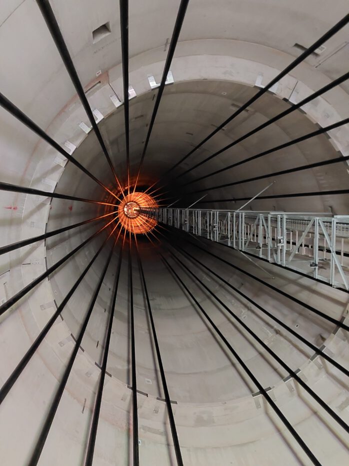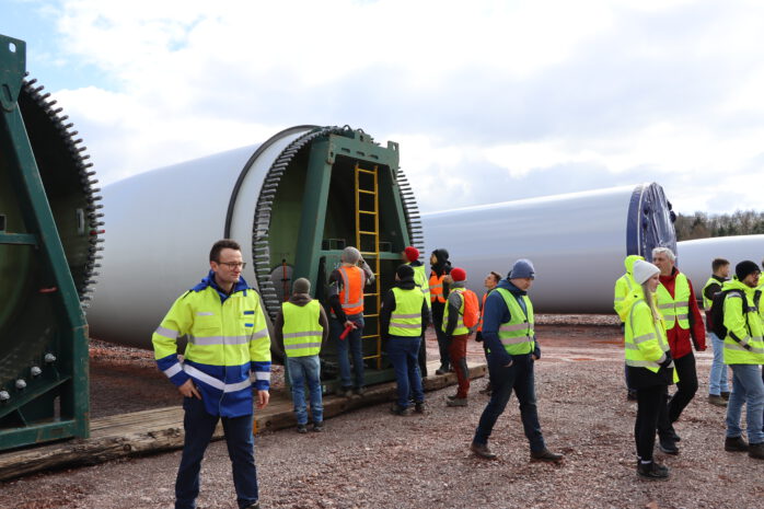 Ein besonderer Fokus lag auf dem Aufbau des Hybridturms, der im unteren Bereich aus gestapelten Betonsegmenten und im oberen Bereich aus aufgesetzten Stahlröhren besteht. Bemerkenswert ist hierbei, dass die Betonsegmente im Inneren durch Spannsysteme zusammengehalten werden und dennoch den enormen statischen und dynamischen Belastungen standhalten. Diese Bauweise stellt eine innovative ingenieurtechnische Lösung dar und basiert auf einem deutschen Patent. Neben der mechanischen Konstruktion wurde auch die elektrische Infrastruktur des Windparks betrachtet. So konnten die Trafostation sowie der Netzanschlusspunkt besichtigt werden, wodurch die Bedeutung der Netzintegration für den Betrieb der Anlagen deutlich wurde. Insgesamt bot die Exkursion einen praxisnahen und anschaulichen Einblick in die komplexen Zusammenhänge der Energiewende und verdeutlichte die vielfältigen technischen Herausforderungen beim Bau und Betrieb moderner Windenergieanlagen.