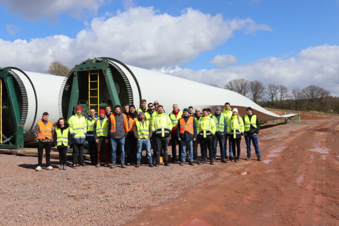 Im Rahmen einer Exkursion besuchten rund 20 Studierende der Elektrotechnik den im Bau befindlichen Windpark in Saarwellingen und erhielten dabei einen eindrucksvollen Einblick in die praktische Umsetzung moderner Windenergietechnik. Vor Ort konnten die Anlagen der 5-MW-Klasse mit einer Gesamthöhe von 245,5 Meter aus nächster Nähe erlebt werden. Besonders beeindruckend waren die enormen Dimensionen der Komponenten, insbesondere die rund 80 Meter langen Rotorblätter und die großen Maschinenhäuser. Da sich der Windpark noch in der Errichtungsphase befand, bot sich die seltene Gelegenheit, zentrale Bauteile wie Turmsegmente, Gondel und weitere Großkomponenten am Boden zu besichtigen. Der Turm konnte zudem teilweise von innen begangen werden, wodurch ein direkter Eindruck der Konstruktion gewonnen wurde.
